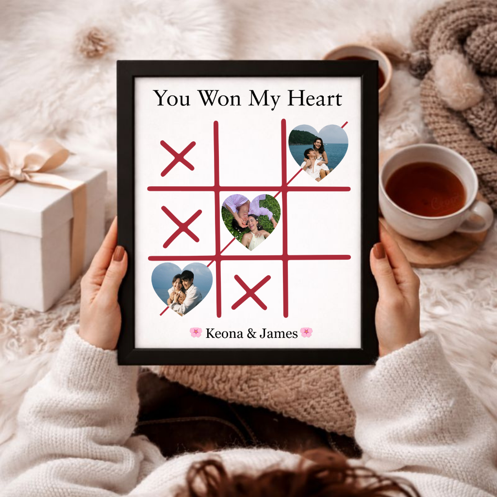 Upload three photos of you and your partner — they'll appear as hearts forming the winning diagonal line on the tic-tac-toe board. Choose a romantic title from our options like "You Won My Heart," "The Winning Line was us," "Love always wins," "Every move led me to you," or write your own custom message. Add both your names at the bottom to complete the design.