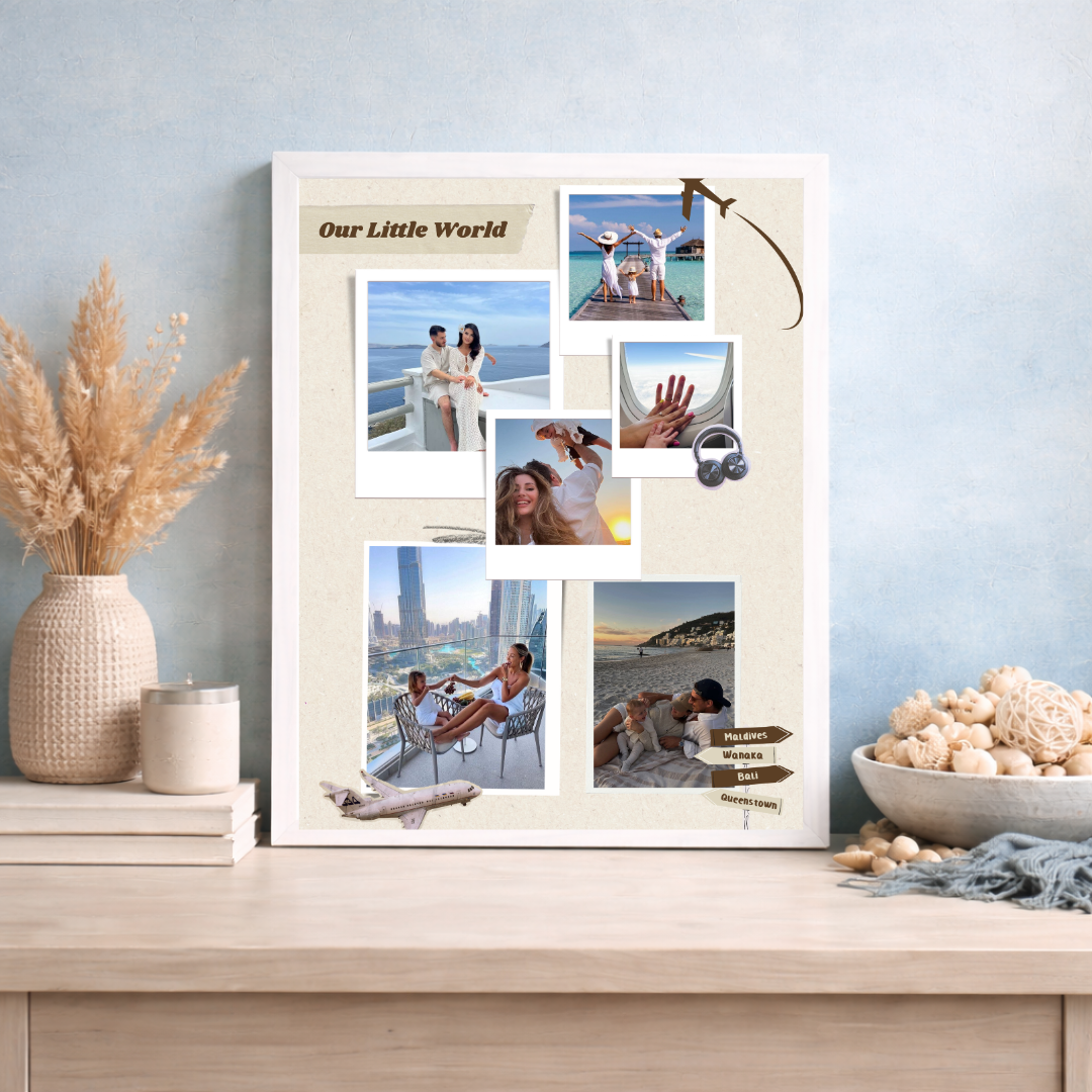 With charming travel-themed details like an airplane soaring across the design, a miniature plane model, vintage headphones, and polaroid-style photo frames, this custom travel poster captures that aesthetic wanderlust vibe perfectly. Whether you're preserving memories from a gap year, honeymoon, family holiday, or solo backpacking trip, this is the ultimate way to keep your adventures alive and beautifully displayed.