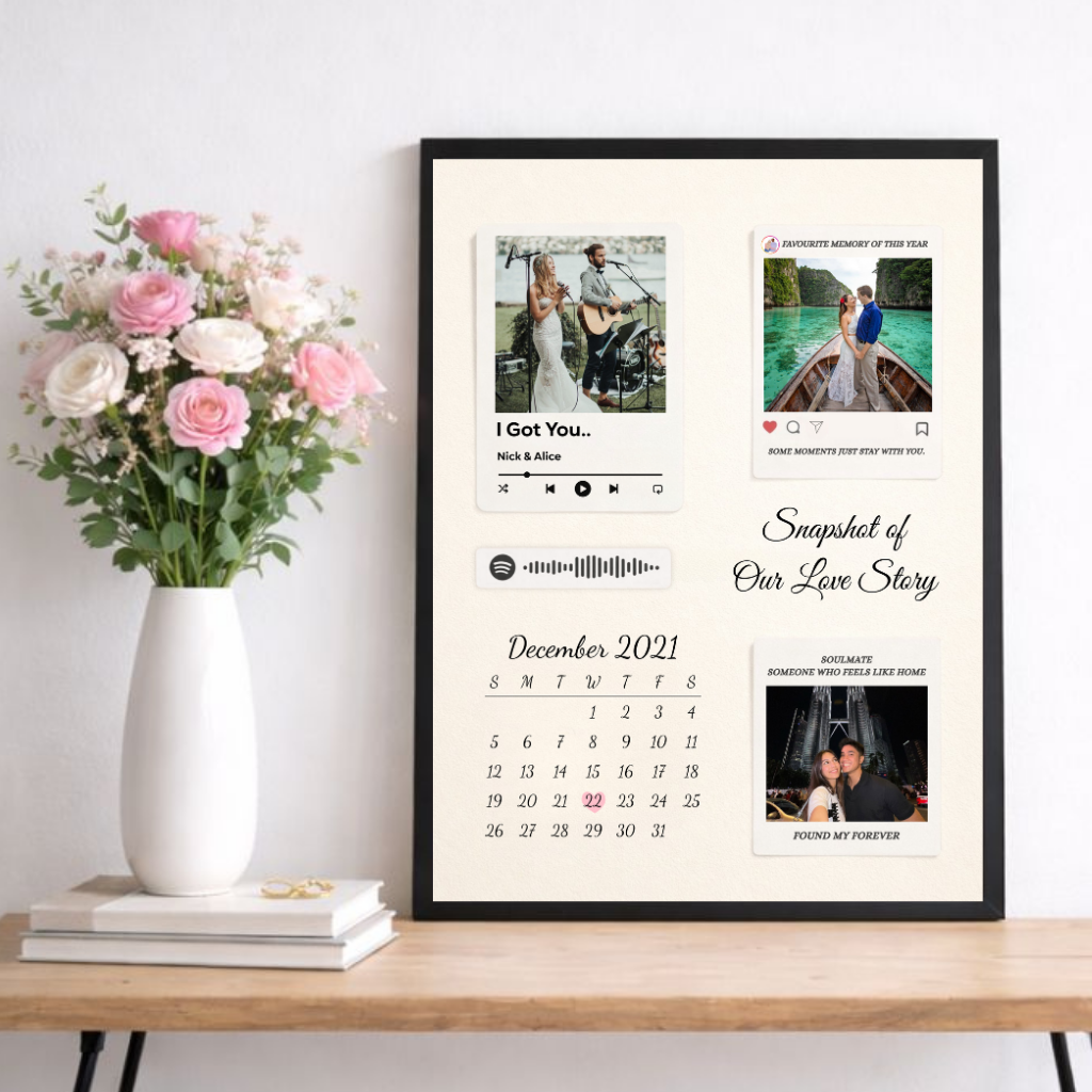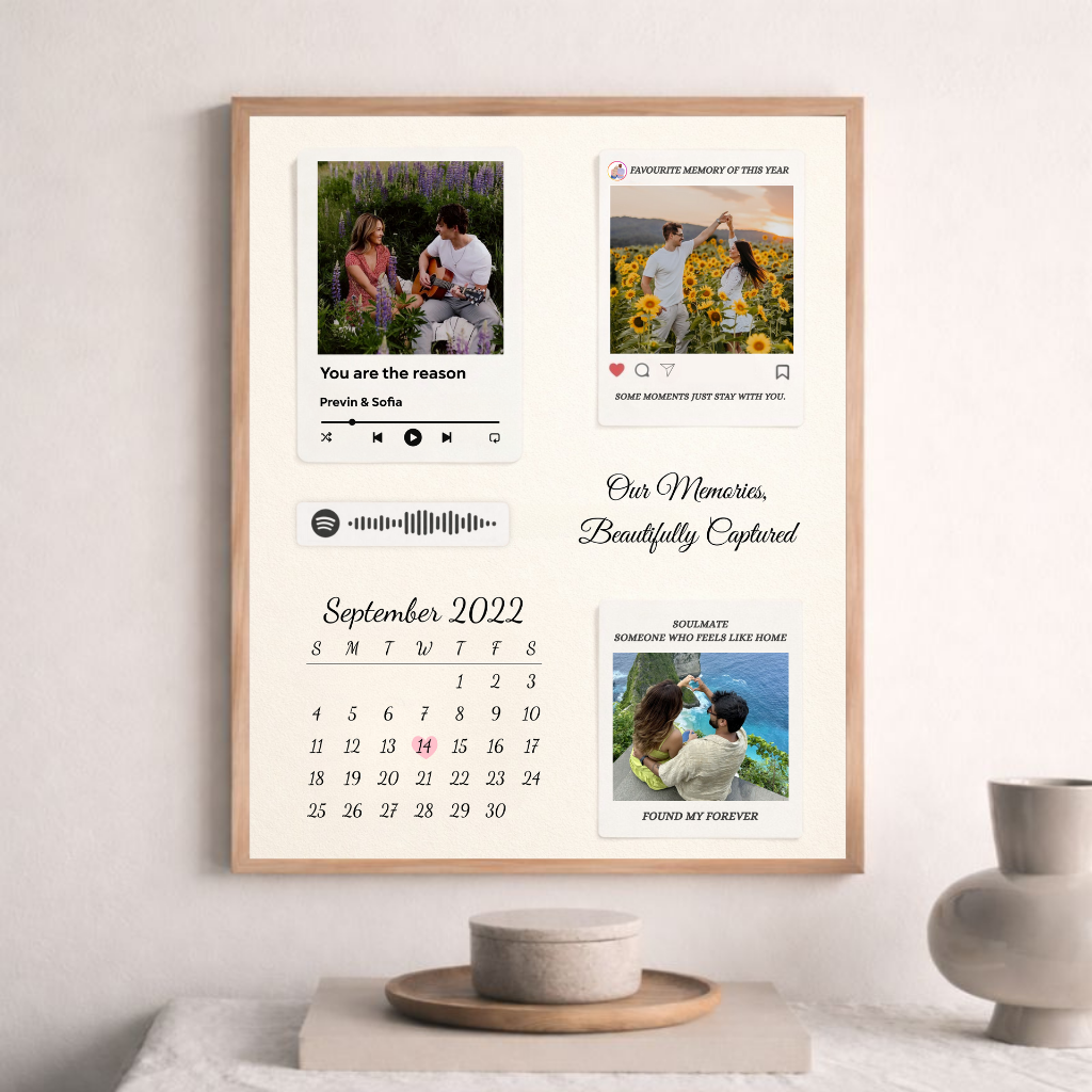 Capture the moments that define your relationship with a personalised song and memory calendar poster. Add your favourite photos, include a meaningful song, and highlight the date that changed everything — from the day you met to the moment you became forever.